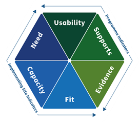 The framework provides information about interventions across six dimensions, based on the hexagon tool below (developed by the National Implementation Research Network).