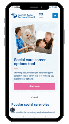 The Social Care Career Options tool is an online tool designed to support people who are looking to learn more about working in the Scottish Social Care sector. It is aimed both at those who are looking to progress their existing career, and those who are completely new to the sector. The site features helpful information about over 70 job roles in the sector, as well as inspiring stories from social care workers.